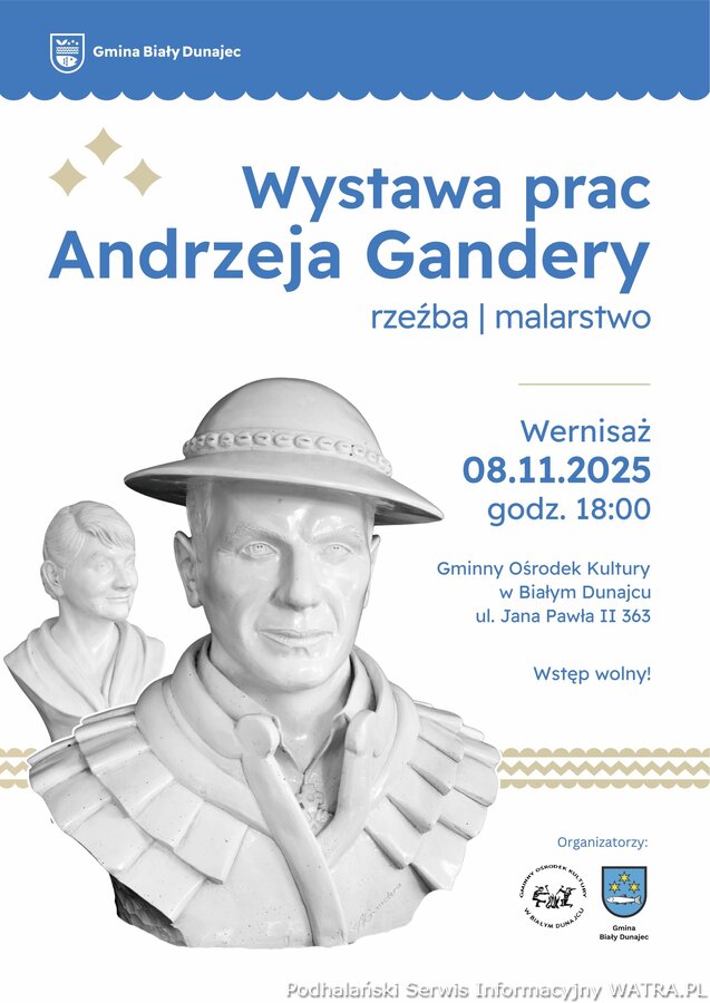 Gminny Ośrodek Kultury im. gen. bryg. Andrzeja Galicy w Białym Dunajcu serdecznie zaprasza na otwarcie wystawy prac Andrzeja Gandery, które odbędzie się w sobotę, 8 listopada 2025 roku, o godz. 18:00 w sali wystawowej GOK, przy ul. Jana Pawła II 363. Podczas wernisażu goście będą mogli zapoznać się z twórczością Andrzeja Gandery – artysty z Białego Dunajca, który z wielką pasją tworzy zarówno rzeźby, jak i obrazy.