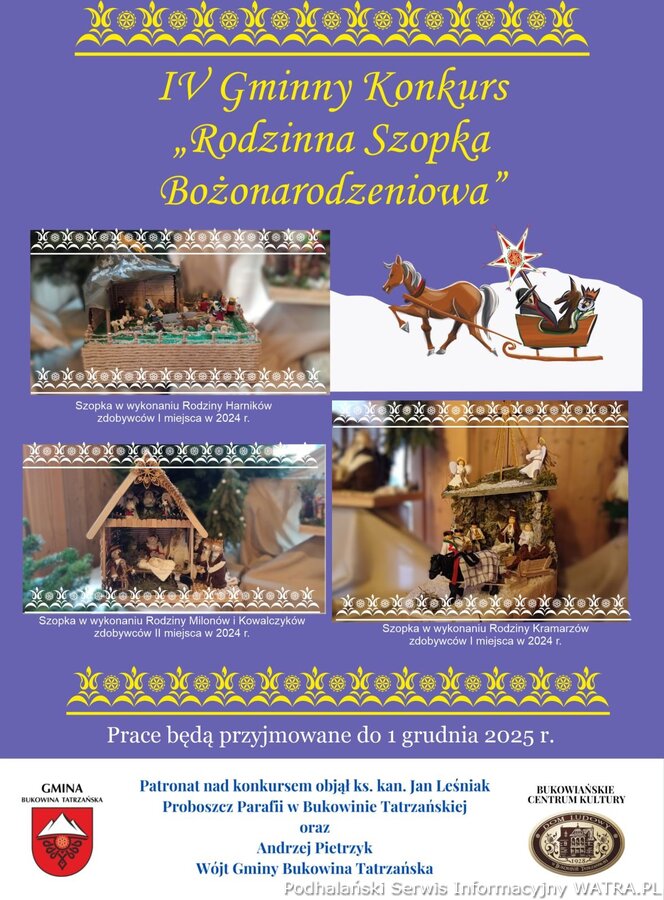 Po raz 4. zapraszamy rodziny z terenu gminy Bukowina Tatrzańska do udziału w Gminnym Konkursie „Rodzinna Szopka Bożonarodzeniowa”. Celem konkursu jest: Integracja członków rodziny, poprzez twórcze zaangażowanie w realizację projektu. Pielęgnowanie wartości religijnych związanych ze świętami Bożego Narodzenia, głównie ich obrzędowością, poprzez prezentację szopki bożonarodzeniowej jako elementu kultury chrześcijańskiej. Rozwijanie uzdolnień plastycznych oraz poszerzenie wiedzy w zakresie kultury i sztuki Podhala. Termin dostarczania prac do Domu Ludowego – 1 grudnia 2025 r. Regulamin i karta zgłoszenia dostępne są na stronie Domu Ludowego pod linkiem...