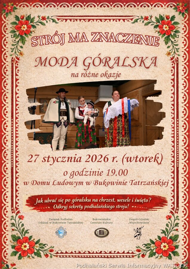 Bukowiańskie Centrum Kultury „Dom Ludowy” zaprasza: 27 stycznia (wtorek), godz. 19.00 – Dom Ludowy Pokaz mody podhalańskiej „Moda góralska na różne okazje” przygotowany przez Związek Podhalan Oddział w Bukowinie Tatrzańskiej oraz Zespół Góralski „Wiyrchowianie”.