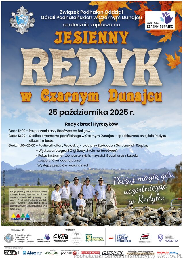 W sobotę, 25 października Czarny Dunajec stanie się centrum góralskiej tradycji i kultury! W ramach Jesiennego Redyku braci Hyrczków odbędzie się Festiwal Kultury Wołoskiej – niezwykle barwne wydarzeń w regionie, podczas którego zobaczymy uroczysty przemarsz baców, juhasów i stada owiec ulicami miasta przy dźwiękach kapeli zespołu „Cornodunajcanie”. W programie znajdą się występy zespołów regionalnych – Gminnej Kapeli „Cornodunajeckie Orły”, „Mali Miętusianie” oraz „Krzesany” z Cichego. Nie zabraknie także pokazów pasterskich: strzyżenia owiec czy wyrobu oscypków, degustacji lokalnych przysmaków oraz spotkania z bacami i juhasami. Dla najmłodszych przygotowano wyjątkową atrakcję – malowanie specjalnie przygotowanych owiec z Wojciechem Pondlem.