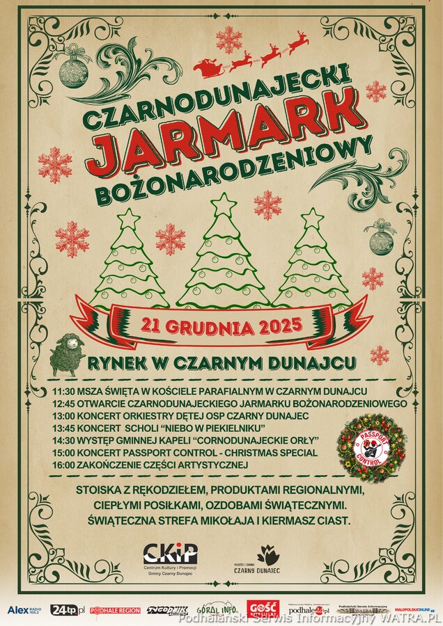 Nie może też zabraknąć muzycznych akcentów. Świąteczną atmosferę wydarzenia podkreśli program artystyczny, w ramach którego wystąpią lokalni artyści i zespoły. Publiczność usłyszy m.in. kolędy i utwory świąteczne w wykonaniu Orkiestry Dętej OSP Czarny Dunajec, Scholi „Niebo w Piekielniku”oraz Gminnej Kapeli „Czarnodunajeckie Orły”. Najmłodszych uczestników jarmarku z pewnością ucieszy obecność Świętego Mikołaja, który zadba o szerokie uśmiechy. Zwieńczeniem jarmarku będzie koncert Passport Control – Christmas Special, podczas którego zabrzmią znane i lubiane świąteczne hity.