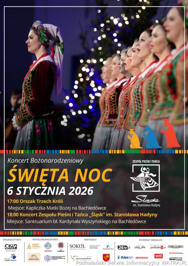 Miasto i Gmina Czarny Dunajec zapraszają wszystkich mieszkańców oraz gości na niezwykłe wydarzenie kulturalne, które odbędzie się 6 stycznia 2026 roku w Sanktuarium bł. Kardynała Stefana Wyszyńskiego na Bachledówce. W ten wyjątkowy wieczór rozbrzmią najpiękniejsze polskie kolędy w wykonaniu znanego i cenionego Zespołu Pieśni i Tańca „Śląsk” im. Stanisława Hadyny — jednego z najbardziej rozpoznawalnych zespołów folklorystycznych w kraju. Przed koncertem wszyscy chętni będą mogli wziąć udział w tradycyjnym Orszaku Trzech Króli, który w barwny i radosny sposób przypomni o wyjątkowym znaczeniu trwającego święta. Orszak, z koronami na głowach i kolorowymi insygniami, poprowadzi uczestników do Sanktuarium, tworząc atmosferę wspólnoty i świątecznej radości.