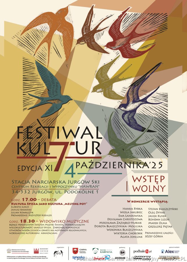 4 października 2025 (sobota). Miejsce: Stacja Narciarska Jurgów Ski - Centrum Rekreacji i Wypoczynku „Hawrań” - 34-532 Jurgów, ul. Podokólne 1. Program: Godz. 17.00 – Debata Kultura Spisza jako kultura „melting pot” Godz. 18.30 – Widowisko muzyczne Będące prawdziwym świętem muzyki świata, podkreślającym wielokulturowość samego Spisza. Zabrzmią kompozycje utworów współczesnych oparte na motywach regionalnych, wzbogacone autorskimi aranżacjami.