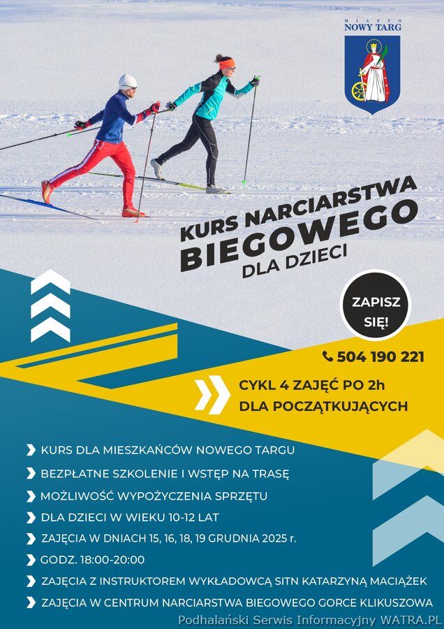 Zapraszamy na bezpłatny kursu narciarstwa biegowego dla dzieci w wieku od 10 do 12 lat. Kurs skierowany jest dla początkujących narciarzy zamieszkałych w Nowym Targu i będzie obejmował cykl 4 zajęć po 2h. Zajęcia będą się odbywać w dniach 15, 16, 18, 19 grudnia 2025 r. w godzinach od 18:00 do 20:00. Miejscem szkolenia będzie Centrum Narciarstwa Biegowego Gorce Klikuszowa. Zgłoszenia można dokonać telefonicznie 504 190 221. Zgłoszenie do kursu wiąże się z podpisaniem deklaracji udziału we wszystkich 4 zajęciach.