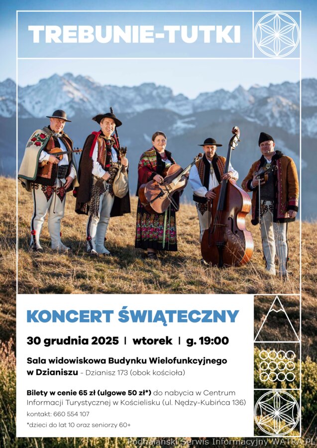 Gminny Ośrodek Kultury Regionalnej Kościelisko zaprasza na koncert świąteczny zespołu Trebunie-Tutki. Koncert odbędzie się 30 grudnia 2025 r. o godzinie 19:00 w Dzianiszu - w sali widowiskowej budynku wielofunkcyjnego (Dzianisz 173 obok kościoła). Bilety do nabycia w Centrum Informacji Turystycznej w Kościelisku w dni robocze w godzinach 8:30-16:30, w soboty od 10:00-14:00. Oferujemy bilety ulgowe dla dzieci do lat 10 oraz seniorów 60+.