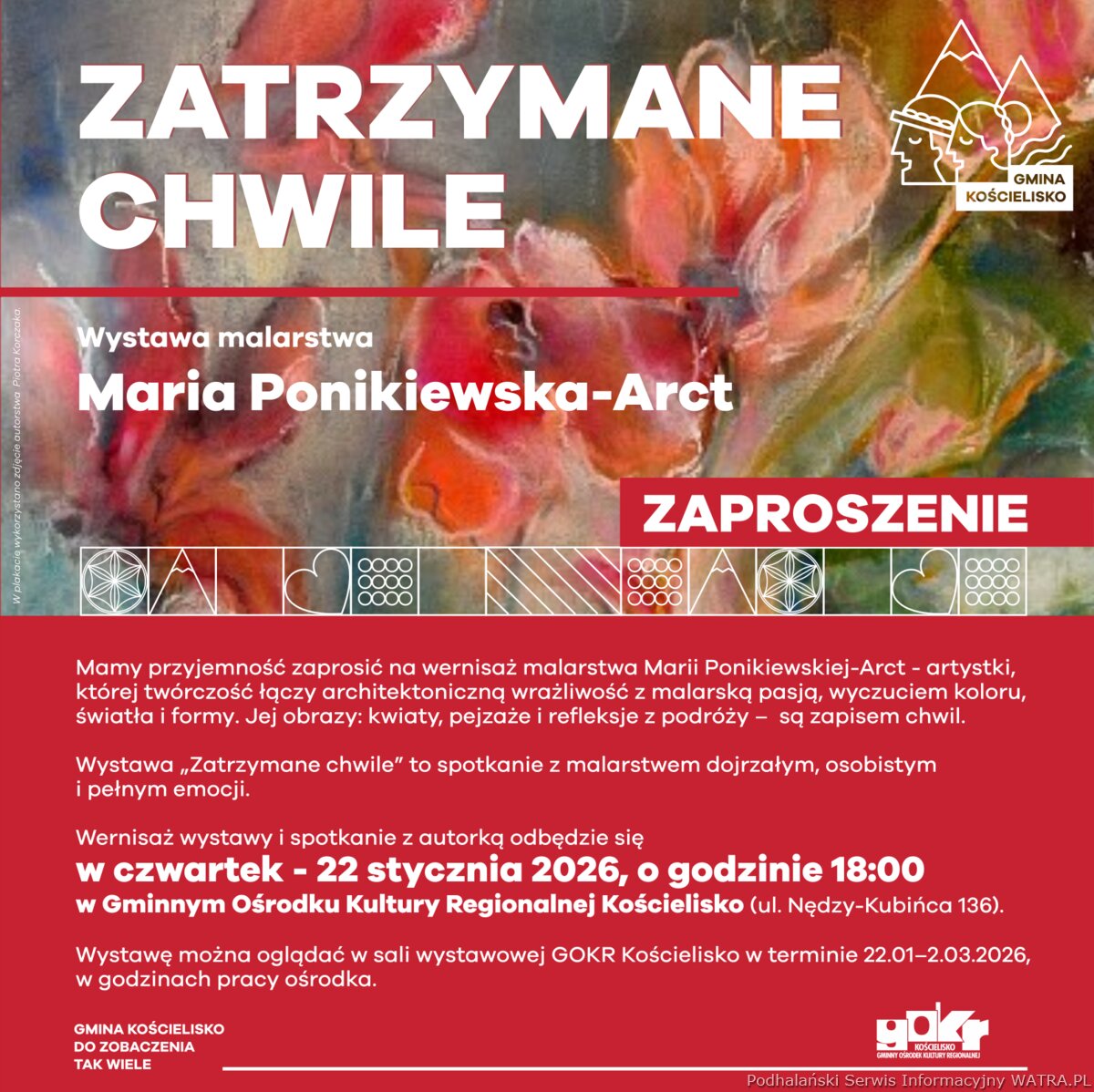 Mamy przyjemność zaprosić na wystawę malarstwa Marii Ponikiewskiej-Arct – artystki, której twórczość łączy architektoniczną wrażliwość z malarską pasją, wyczuciem koloru, światła i formy. Jej obrazy – kwiaty, bukiety, pejzaże i refleksje z podróży – są zapisem chwil. Jak pisał prof. Wiktor Zin w recenzji wystawy "Zatrzymane Chwile" (2006): „W krajobrazach autorka jest najbardziej oryginalna, bo niektóre prace porażają wręcz tym osobliwym widzeniem światła, które zachwycić potrafi każdego kształtem skał, obłoków, w końcu całością dzieła.” Wystawa „Zatrzymane chwile” to spotkanie z malarstwem dojrzałym, osobistym i pełnym emocji. Wernisaż wystawy i spotkanie z autorką odbędzie się w czwartek 22 stycznia 2026 r. o godzinie 18:00 w Gminnym Ośrodek Kultury Regionalnej Kościelisko (ul. Nędzy-Kubińca 136)