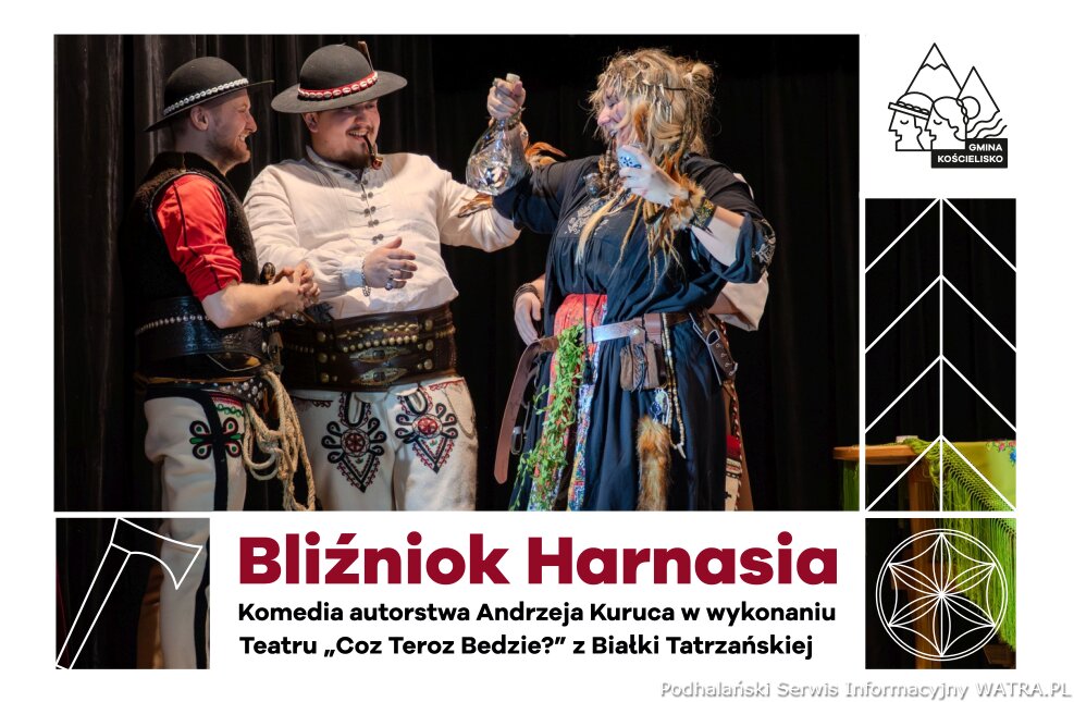 Gmina Kościelisko ma przyjemność gościć Teatr "Coz Teroz Bedzie?" z Białki Tatrzańskiej. Tym razem aktorzy zaprezentują komedię „Bliźniok Harnasia” autorstwa Andrzeja Kuruca. Ich spektakl to gwarancja dużej dawki humoru, barwnych postaci i niezapomnianej atmosfery – kto był wcześniej, ten wie, że naprawdę warto! Zapraszamy 23 kwietnia 2026 (czwartek) o godzinie 19:00 do budynku wielofunkcyjnego w Dzianiszu.