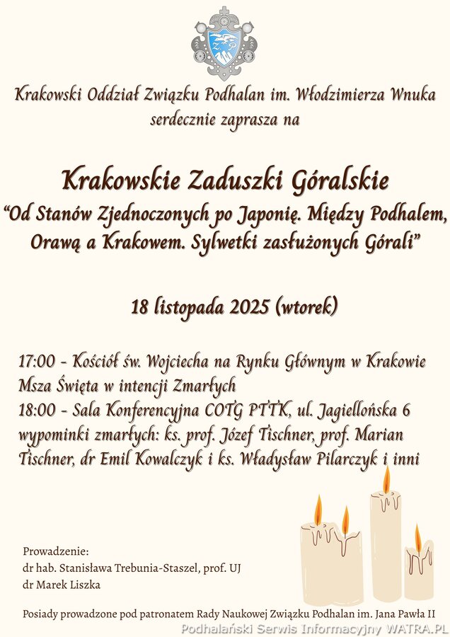 Krakowski Oddział Związku Podhalan im. Włodzimierza Wnuka serdecznie zaprasza na Krakowskie Zaduszki Góralskie pod hasłem: „Od Stanów Zjednoczonych po Japonię. Między Podhalem, Orawą a Krakowem. Sylwetki zasłużonych Górali” 18 listopada 2025 r. (wtorek) 17:00 – Msza Święta w intencji Zmarłych w kościele św. Wojciecha na Rynku Głównym w Krakowie 18:00 – spotkanie wspomnieniowe w sali konferencyjnej COTG PTTK, ul. Jagiellońska 6