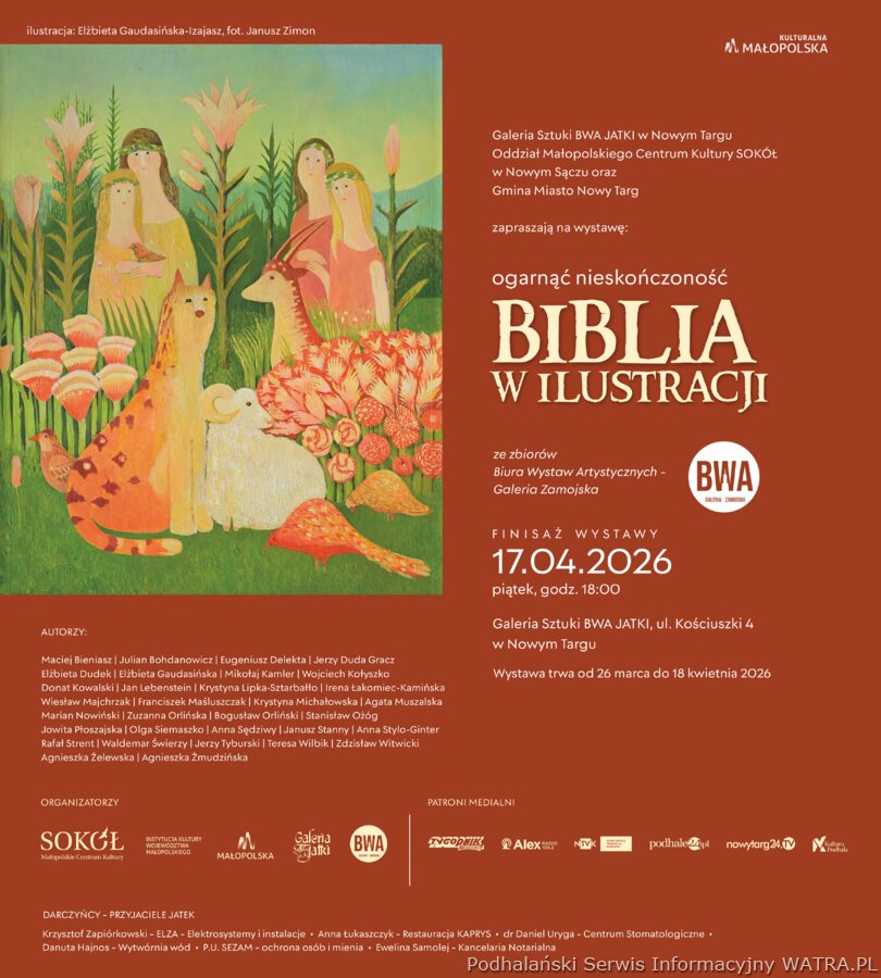 W Galerii Sztuki BWA JATKI w Nowym Targu - o/ Małopolskiego Centrum Kultury SOKÓŁ w Nowym Sączu - można już oglądać nową wystawę: "Ogarnąć nieskończoność. Biblia w ilustracji." - ze zbiorów Biura Wystaw Artystycznych - Galeria Zamojska Wystawa trwać będzie do 18 kwietnia, a na zakończenie, w piątek 17 kwietnia o godz. 18.00 zapraszamy na finisaż.
