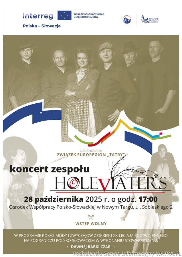 Koncert zespołu HOLEVIATERS, który odbędzie się w dniu 28.10.2025 r. o godz. 17:00 w Ośrodku Współpracy Polsko-Słowackiej w Nowym Targu ul. Sobieskiego 2. Uprzejmie prosze o zamieszczenie plakatu na Państwa stronach internetowych. W ramach wydarzenia odbędzie się również pokaz mody i zwyczajów z okresu XX-lecia międzywojennego na pograniczu polsko-słowackim w wykonaniu Stowarzyszenia Dawnej Rabki Czar.