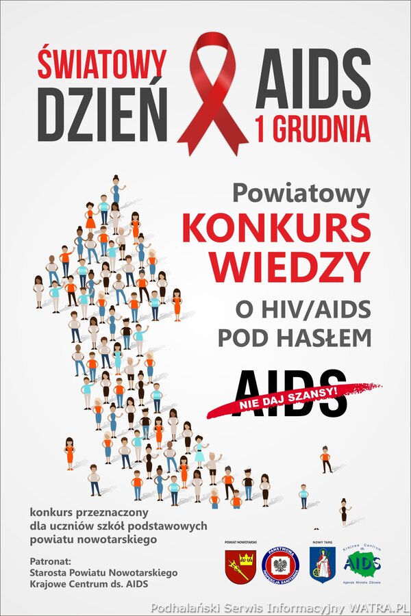 W poniedziałek 1 grudnia, o godz. 10.00, z okazji Światowego Dnia Walki z AIDS, w sali obrad Urzędu Miasta w Nowym Targu odbędzie się XXIII edycja Powiatowego Konkursu Wiedzy o HIV/AIDS pod hasłem „Nie daj szansy AIDS”. Do etapu powiatowego zgłoszonych zostało 64 uczniów z 22 szkół podstawowych. W eliminacjach szkolnych udział wzięło 152 uczniów. Konkurs, organizowany jest cyklicznie przez Powiatową Stację Sanitarno-Epidemiologiczną w Nowym Targu, pod patronatem Starosty Powiatu Nowotarskiego oraz Krajowego Centrum ds. AIDS.