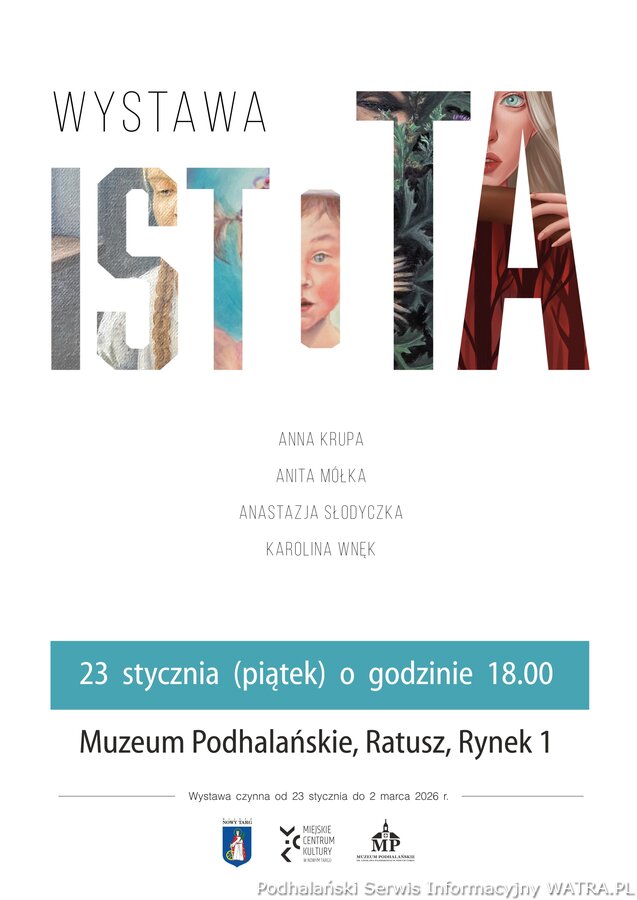 Burmistrz Miasta Nowego Targu, Miejskie Centrum Kultury w Nowym Targu, Muzeum Podhalańskie im. Czesława Pajerskiego w Nowym Targu oraz Artystki: Anna Krupa, Anita Mółka, Anastazja Słodyczka, Karolina Wnęk mają zaszczyt zaprosić na wernisaż wystawy „IstoTA”, który odbędzie się 23 stycznia (piątek), o godzinie 18.00 w Muzeum Podhalańskim, Ratusz, Rynek 1. Wystawa czynna będzie od 23 stycznia do 2 marca 2026 r.