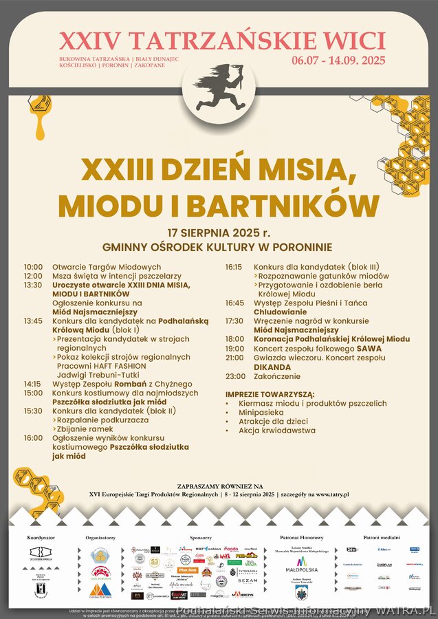 Gmina Poronin zaprasza na XXIII Dzień Misia, Miodu i Bartników – święto pszczelarstwa, tradycji i lokalnych smaków, które odbędzie się już w najbliższą niedzielę, 17 sierpnia 2025 r. na terenie Gminnego Ośrodka Kultury w Poroninie. Wydarzenie na stałe wpisało się w kalendarz kulturalny Podhala i co roku przyciąga tłumy mieszkańców oraz turystów. W tegorocznym programie przewidziano szereg atrakcji zarówno dla dzieci, jak i dorosłych. Wśród najważniejszych punktów programu znalazły się...