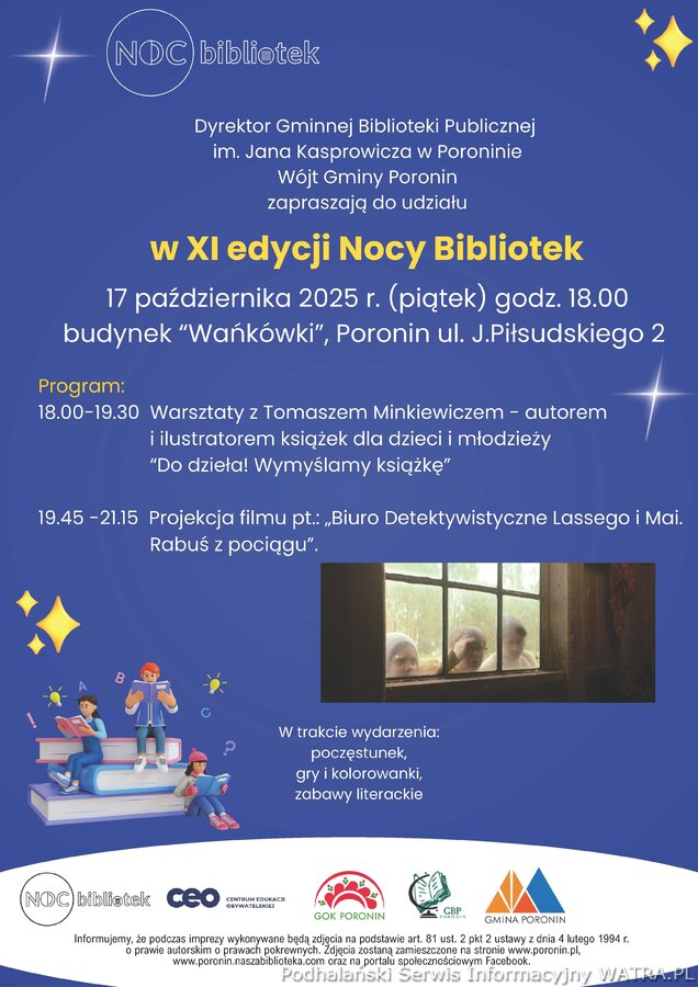 Gminna Biblioteka Publiczna w Poroninie oraz Wójt Gminy Poronin zapraszają dzieci, rodziców i całe rodziny na XI edycję ogólnopolskiej akcji Noc Bibliotek, która odbędzie się 17 października 2025 roku w siedzibie biblioteki. W programie:18:00–19:30 – warsztaty z Tomaszem Minkiewiczem pt. „Do dzieła! Wymyślamy książkę” 19:45–21:15 – projekcja filmu familijnego „Biuro Detektywistyczne Lassego i Mai. Rabuś z pociągu” Dodatkowe atrakcje: słodki poczęstunek, gry i kolorowanki dla najmłodszych.