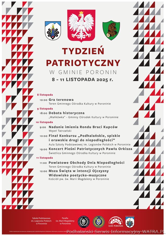 Tydzień Patriotyczny to cykl wydarzeń kulturalnych, edukacyjnych i artystycznych, których celem jest wspólne uczczenie 107. rocznicy odzyskania przez Polskę niepodległości. W programie znalazły się m.in. gra terenowa, debata historyczna, koncert pieśni patriotycznych, uroczystości powiatowe oraz wydarzenia upamiętniające lokalnych bohaterów i drogi do niepodległości regionu Podhala, Spisza i Orawy.