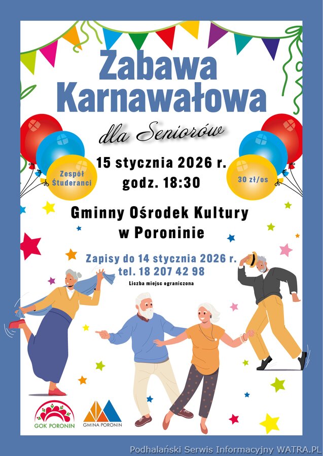 Gmina Poronin oraz Gminny Ośrodek Kultury w Poroninie zapraszają mieszkańców Gminy Poronin – Seniorów na zabawę karnawałową, która odbędzie się 15 stycznia 2026 roku o godzinie 18:30 w Świetlicy GOK w Poroninie. Wydarzenie będzie doskonałą okazją do wspólnej zabawy, integracji oraz spędzenia czasu w miłej, karnawałowej atmosferze. Organizatorzy zachęcają do udziału wszystkich Seniorów z terenu gminy.