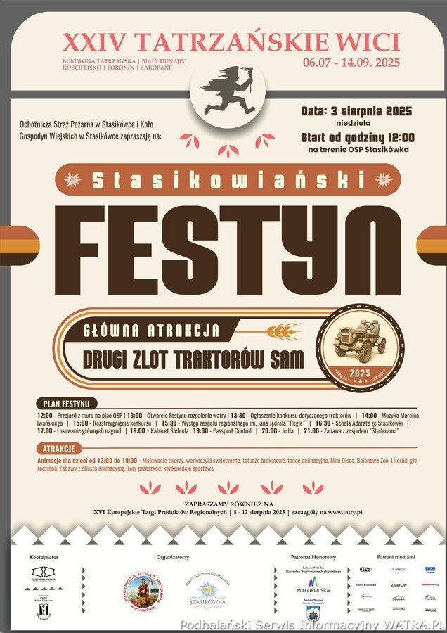 Tatrzańskie Wici to cykl letnich wydarzeń folklorystycznych organizowanych od 2001 roku w gminach powiatu tatrzańskiego, przede wszystkim na Podhalu. Inicjatywa ta ma na celu popularyzację góralskiej tradycji, muzyki, tańca, rzemiosła i kuchni regionalnej, a także integrowanie lokalnej społeczności i przyciąganie turystów. “Festyn Stasikowiański” – Stasikówka - 3 sierpnia / niedziela.