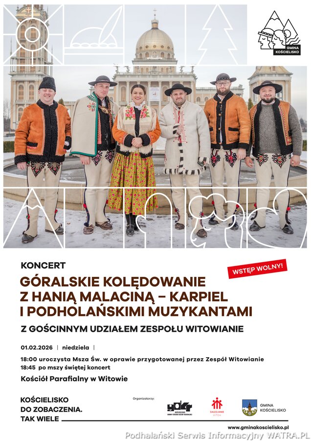 Zapraszamy na Góralskie kolędowanie z Hanią Malaciną–Karpiel i Podholańskimi Muzykantami, z gościnnym udziałem Zespołu Witowianie. Koncert pastorałek góralskich i nie tylko, będziemy mogli usłyszeć w niedzielę 1 lutego po Mszy Świętej o godzinie 18:00 (ok. godz. 18:45) w urokliwym wnętrzu kościoła pod wezwaniem Matki Bożej Szkaplerznej w Witowie.