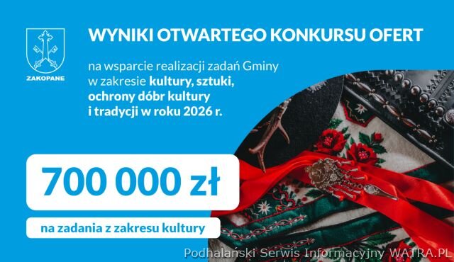 Miasto Zakopane rozstrzygnęło otwarty konkurs ofert na wsparcie realizacji zadań Gminy z zakresu kultury, sztuki, ochrony dóbr kultury i tradycji w roku 2026. W ramach priorytety „Rok Jana Kasprowicza”, ustanowionego przez Radę Miasta Zakopane z okazji 100. rocznicy śmierci Poety, przy wsparciu finansowym Miasta zostanie zrealizowanych kilka projektów. 41 projektów z dziedziny kultury otrzymało wsparcie finansowe na rekordową kwotę 700 tysięcy złotych.