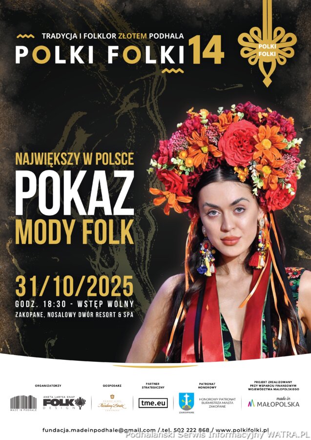 31 października 2025 roku w Nosalowy Dwór Resort & Spa w Zakopanem odbędzie się czternasta edycja wyjątkowego wydarzenia łączącego tradycję, sztukę, kulturę i design – Polki Folki XIV, której organizatorem jest Fundacja Madę in Podhale. Tegoroczna edycja „Tradycja i Folklor Złotem Podhala” celebruje regionalne dziedzictwo, łącząc tradycję i folklor z nowoczesnym wzornictwem oraz sztuką. Złoto Podhala to jego najcenniejsze skarby: bogactwo kultury, piękno natury, majestat gór i barwy krajobrazu, które inspirują projektantów i artystów do tworzenia wyjątkowych dzieł.