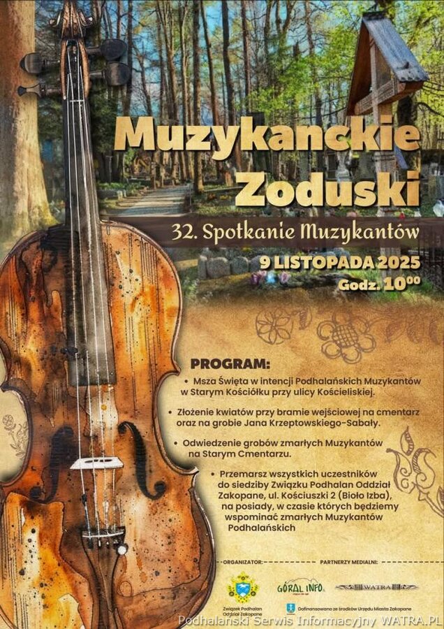 Związek Podhalan Oddział Zakopane serdecznie zaprasza wszystkich muzykantów, przyjaciół muzyki góralskiej oraz sympatyków tradycji podhalańskiej na 32. Muzykanckie Zoduski, które odbędą się 9 listopada 2025 roku (niedziela) o godz. 10:00. To coroczne spotkanie jest okazją, by wspólnie uczcić pamięć zmarłych muzykantów Podhala, oddać im hołd modlitwą, muzyką i wspomnieniem.
