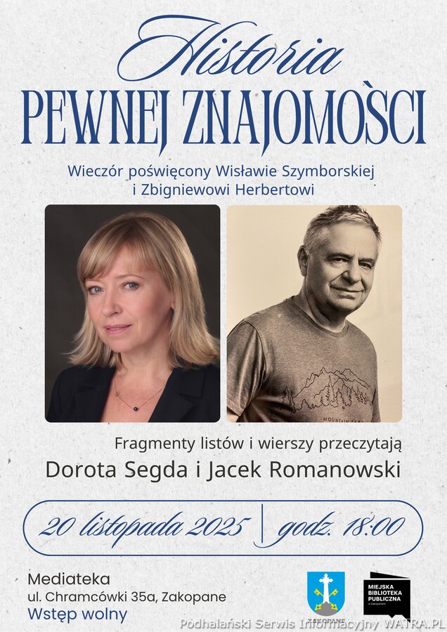 Miasto Zakopane oraz Miejska Biblioteka Publiczna im. Stefana Żeromskiego zapraszają na wieczór poświęcony Wisławie Szymborskiej i Zbigniewowi Herbertowi – wybitnym postaciom polskiej literatury. W programie wieczoru znajdą się fragmenty listów i wierszy poetów w interpretacji znakomitych aktorów: Doroty Segdy i Jacka Romanowskiego. To niezwykła okazja, by wsłuchać się w słowa pełne emocji, refleksji i wzajemnej inspiracji. Data: 20 listopada 2025 r. (czwartek). Godzina: 18:00.Miejsce: MBP w Zakopanem – Mediateka, ul. Chramcówki 35a.