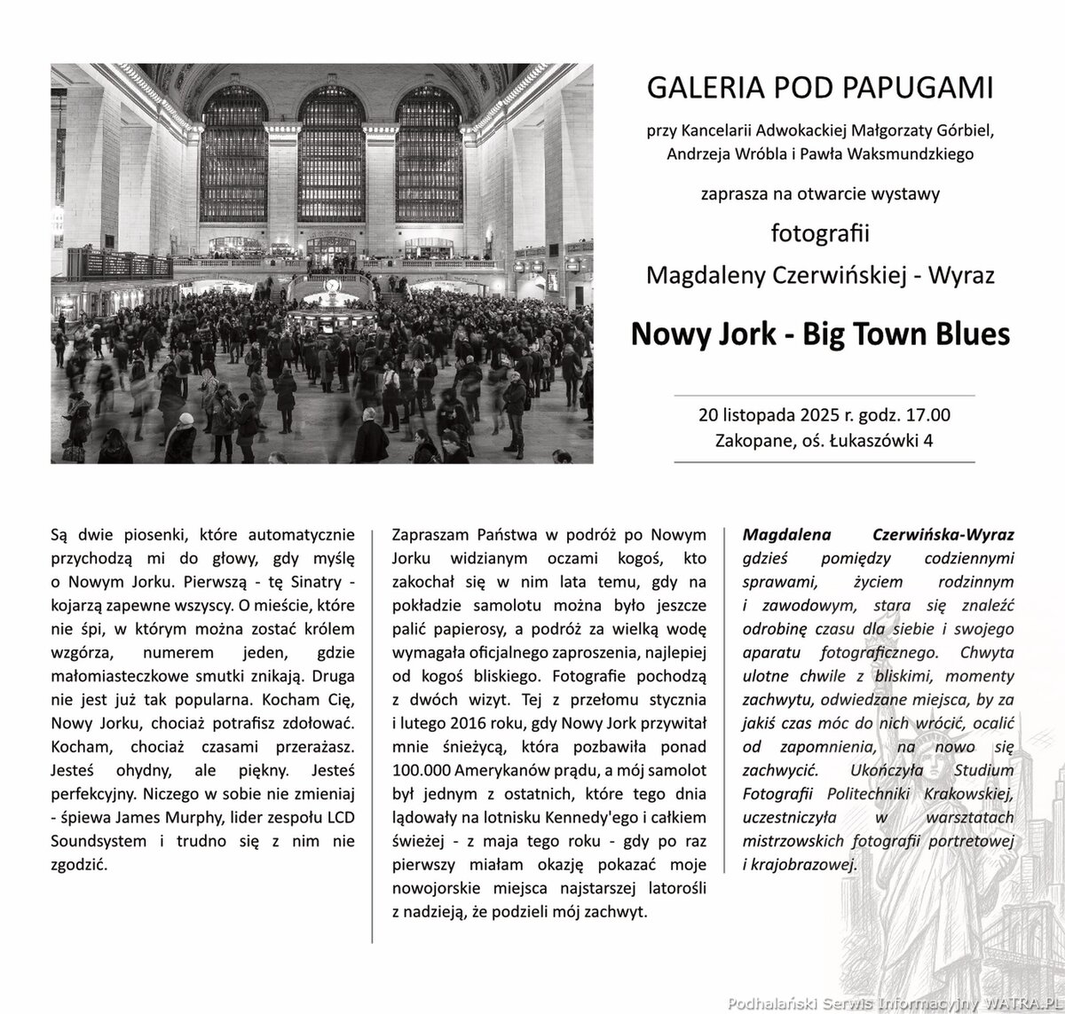 Zapraszamy na otwarcie wystawy fotografii "Nowy Jork - Big Town Blues" autorstwa Magdaleny Czerwińskiej-Wyraz. GALERIA POD PAPUGAMI przy Kancelarii Adwokackiej Małgorzaty Górbiel, Andrzeja Wróbla i Pawła Waksmundzkiego. Oś. Łukaszówki 4, Zakopane. Otwarcie wystawy: 20 listopada 2025 r., godz. 17.00.