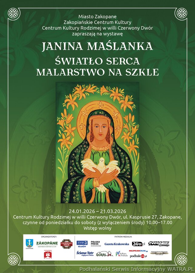 Wernisaż wystawy "Janina Maślanka. światło serca - malarstwo na szkle" odbędzie się 23. stycznia 2026 (piątek) o godz. 17:00. Wystawa dostępna do zobaczenia od 24. stycznia do 21. marca 2026, od poniedziałku do soboty (z wyłączeniem środy) w godz. 10:00 - 17:00. Willa Czerwony Dwór, Centrum Kultury Rodzimej, Kasprusie 27, Zakopane.