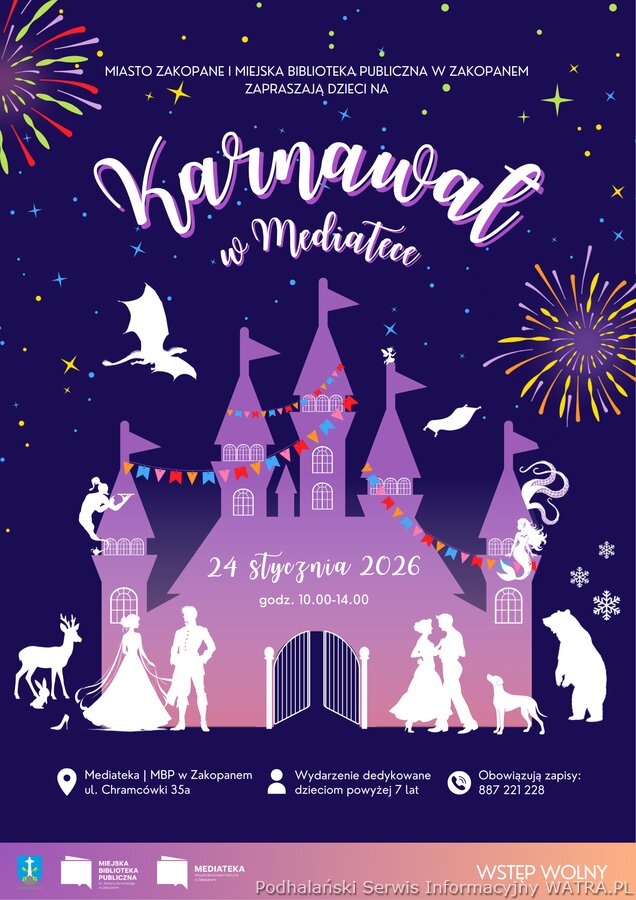 Miasto Zakopane oraz Miejska Biblioteka Publiczna w Zakopanem zapraszają dzieci i rodziców na karnawałowe wydarzenie pełne magii, kolorów i dobrej zabawy. W tym roku Mediateka zamieni się w park jednej z najbardziej znanych wytwórni filmów animowanych dla dzieci i nie tylko. Na uczestników czekają: tworzenie kostiumów inspirowanych ulubionymi postaciami bajek, radosna parada z prezentacją strojów, tańce oraz wspólne zabawy w karnawałowej atmosferze.