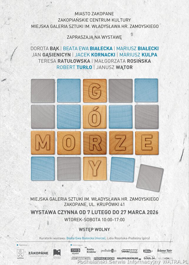 Wernisaż wystawy: 6 lutego 2026 (piątek), godz. 17:00 Miejsce wystawy: Miejska Galeria Sztuki im. Wł. hr. Zamoyskiego, ul. Krupówki 41, Zakopane Kuratorki wystawy: Beata Ewa Białecka (morze), Lidia Rosińska-Podleśny (góry) Organizatorzy: Miejska Galeria Sztuki im. Wł. hr. Zamoyskiego – jednostka Zakopiańskiego Centrum Kultury Artystki i artyści biorący udział w wystawie: Dorota Bąk (góry), Beata Ewa Białecka (morze), Mariusz Białecki (morze), Jan Gąsienicyn (góry), Jan Kornacki (morze), Mariusz Kulpa (morze), Teresa Ratułowska (góry), Małgorzata Rosińska (góry), Robert Turło (morze), Janusz Wątor (góry).