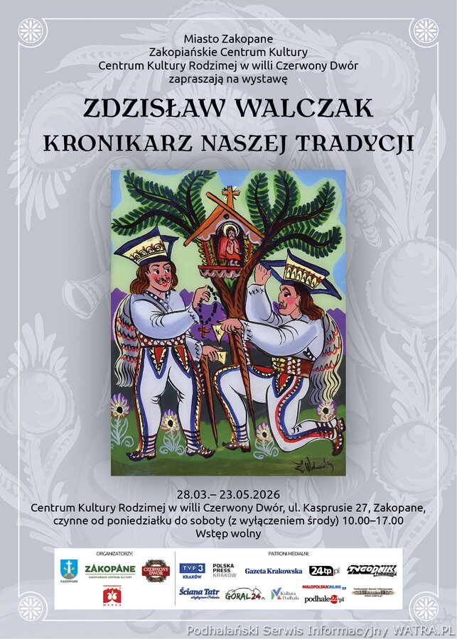 Wernisaż wystawy odbędzie się 27 marca 2026 r. o godz. 17:00. Centrum Kultury Rodzimej w willi Czerwony Dwór, Kasprusie 27. Wstęp na wydarzenie jest wolny. Bohaterem wystawy jest Zdzisław Walczak (1926–2001) – rodowity góral, artysta samouk, malarz na szkle, snycerz, muzykant i gawędziarz, przez całe życie związany z Zakopanem. Choć posiadał jedynie niepełne wykształcenie średnie, zapisał się trwale w historii Podhala jako niezwykle wrażliwy kronikarz życia regionu oraz jego tradycji.
