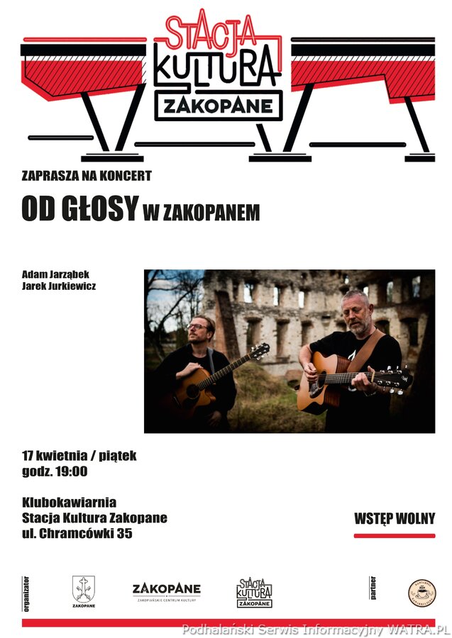 17 kwietnia (piątek), godz. 19:00 Klubokawiarnia Stacja Kultura Zakopane (Chramcówki 35) WSTĘP WOLNY! Zapraszamy na koncert lubelsko-krakowskiego duetu Jarząbek-Jurkiewicz! Duet Jarząbek-Jurkiewicz od 2015 roku łączy w sobie to, co najlepsze w życiu i w muzyce. Turystyka, filozofia, literatura, poezja śpiewana, rock-jazz to tylko niektóre elementy kultury, które rezonują w spotkaniu Adama Jarząbka i Jarka Jurkiewicza. „Wskoczyliśmy na wysokiego konia” – zwykł mawiać w wywiadach wokalista i gitarzysta Adam Jarząbek, odnosząc się do repertuaru duetu. Tym „wysokim koniem” na początku były piosenki Jaromira Nohavicy.
