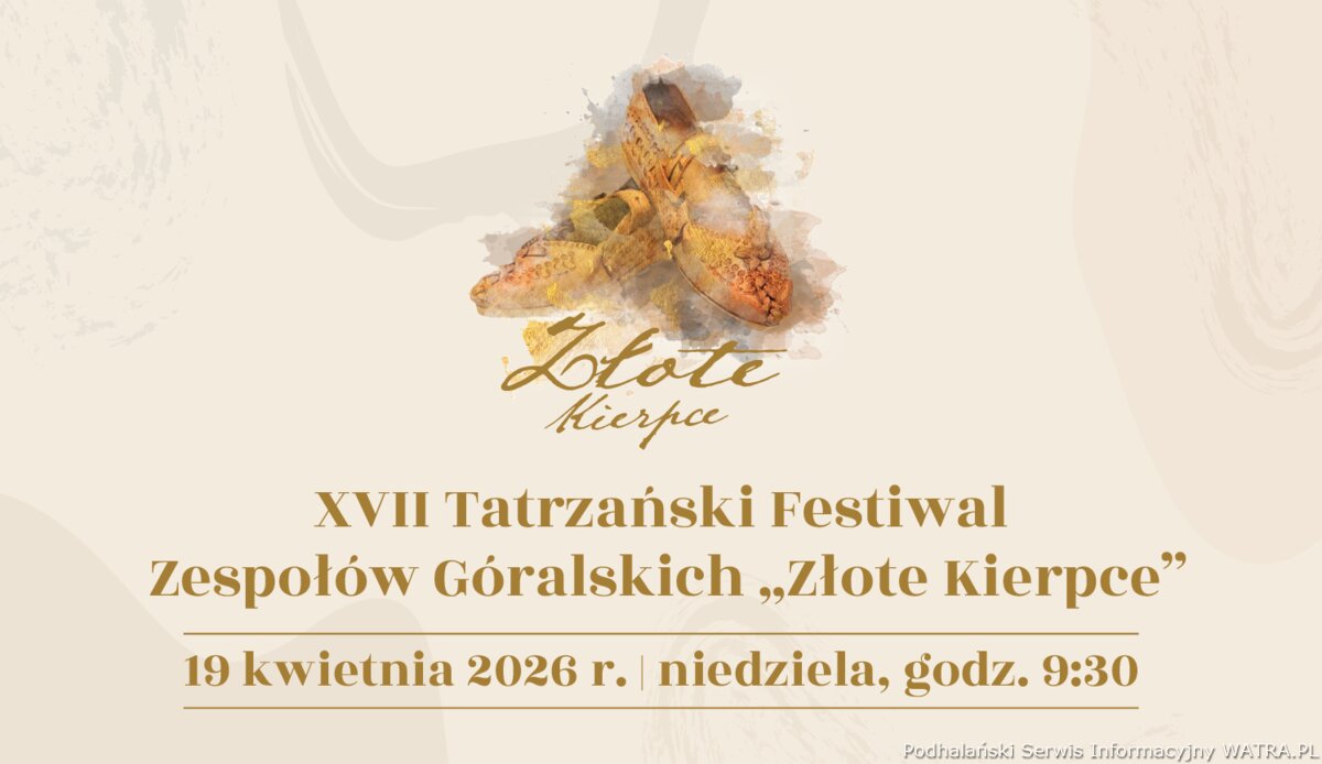 Zapraszamy do udziału w XVII Tatrzańskim Festiwalu Zespołów Góralskich „Złote Kierpce”, wydarzeniu prezentującym dorobek młodych zespołów regionalnych oraz ich zaangażowanie w kultywowanie tradycji Podhala, które w tym roku po raz pierwszy zyska także międzynarodowy charakter. W programie także wernisaż wystawy fotografii na Krupówkach oraz rozstrzygnięcie konkursu plastycznego dla dzieci. Przegląd zespołów odbędzie się w niedzielę, 19 kwietnia 2026 w auli Zakopiańskiego Centrum Edukacji, ul. Kasprusie 35 od godz. 9.30.