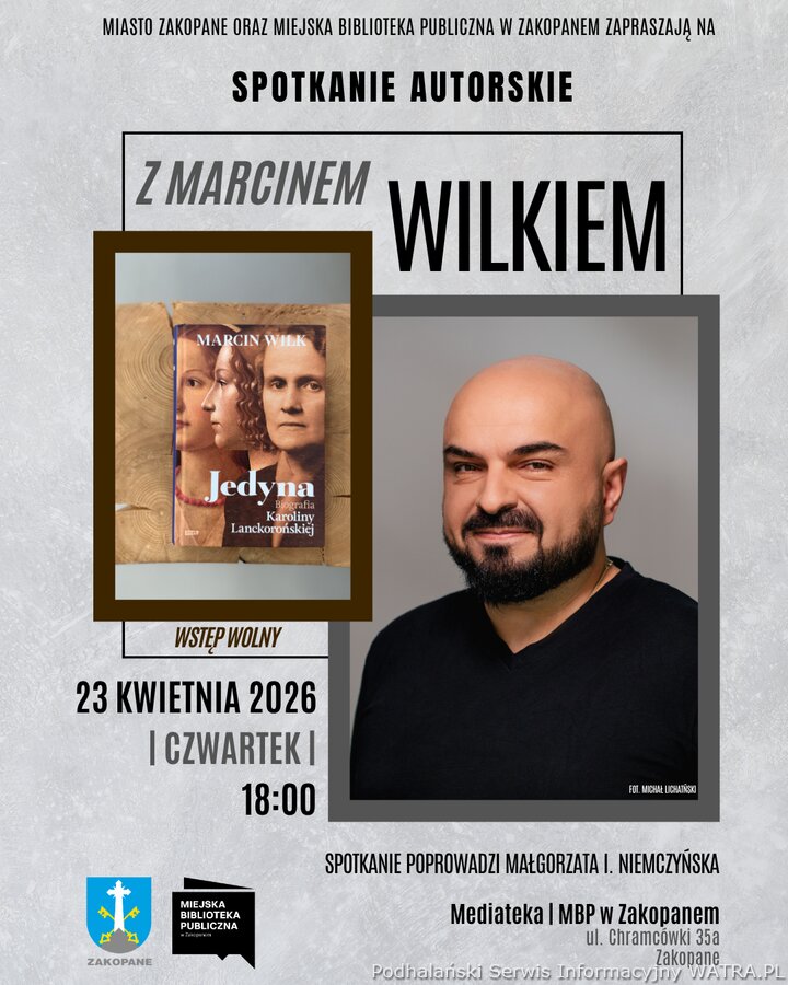 Miasto Zakopane oraz Miejska Biblioteka Publiczna w Zakopanem zapraszają na spotkanie autorskie z Marcinem Wilkiem, pisarzem, literaturoznawcą i badaczem. Autorem trzech, bestsellerowych biografii: „Tyle słońca. Anna Jantar. Biografia”, „Kwiatkowska. Żarty się skończyły” oraz „Jedyna. Biografia Karoliny Lanckorońskiej”, a także esejów historycznych „Pokój z widokiem. Lato 1939” i „Lepszy gatunek. Psio-ludzkie historie” . Wydarzenie odbędzie się 23 kwietnia 2026 roku (czwartek) o godz. 18:00 w Mediatece Miejskiej Biblioteki Publicznej w Zakopanem przy ul. Chramcówki 35a. Spotkanie poprowadzi Małgorzata I. Niemczyńska.